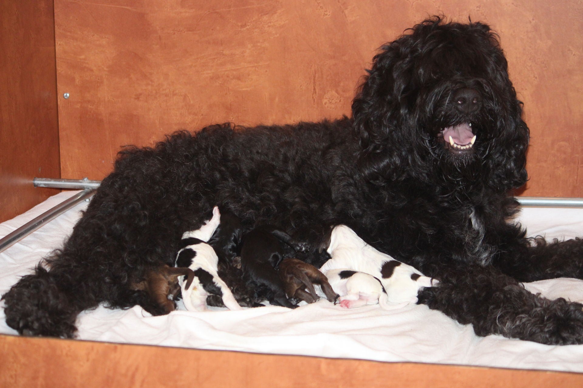 Het zijn 3 teefjes en 4 reutjes geworden. 2 zwart (teefje en reutje) 2 bruin (teefje en reutje) 2 zwartbont (teefje en reutje) en 1 bruinbont reutje.
